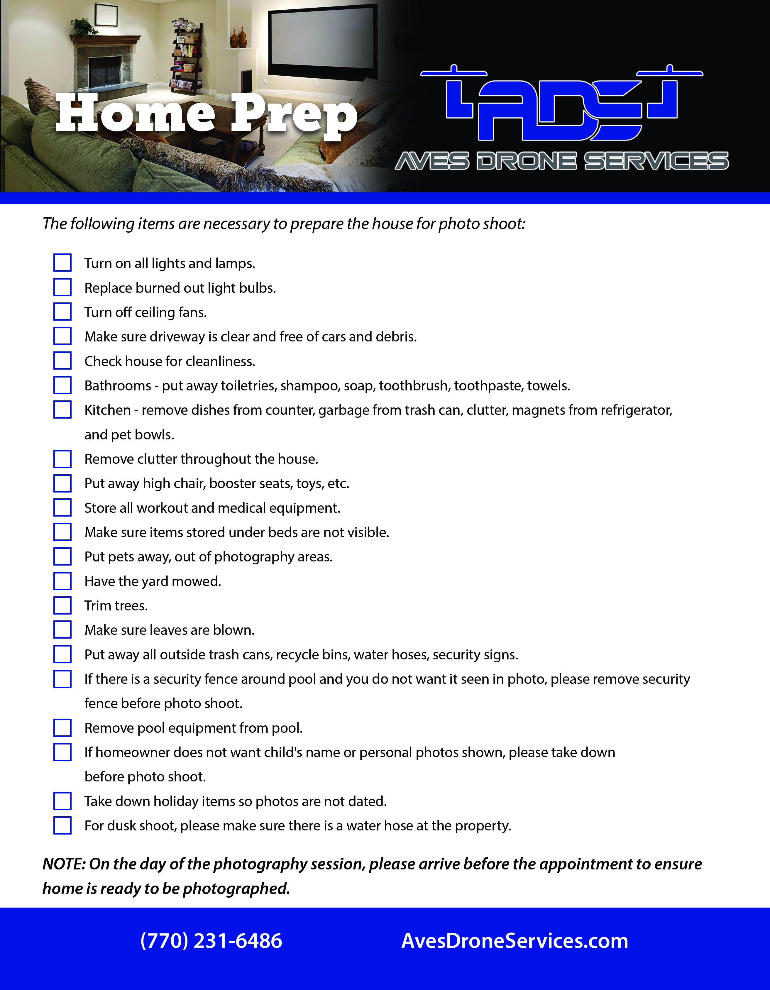 After setting an appointment with Aves Drone Services, please review the home preparation flyer to ensure your property is ready for the photo shoot. Here you will see all those requirements for photography